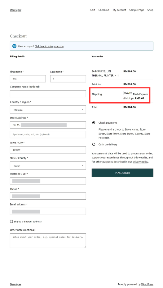 Live shipping rates are automatically calculated based on the destination address and the total cart weight. This allows buyers to select their preferred courier service at checkout. Once buyers place their WooCommerce orders, sellers can view their selected shipping method and also have the flexibility to set up their own preferred shipping methods through the EasyParcel plugin.
