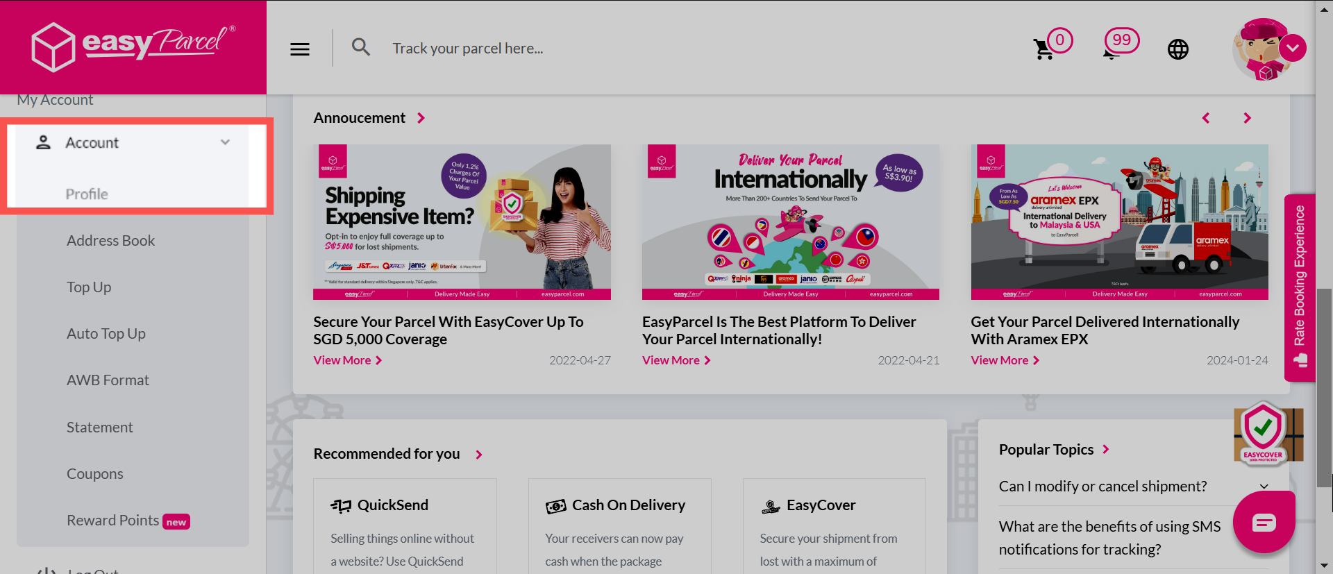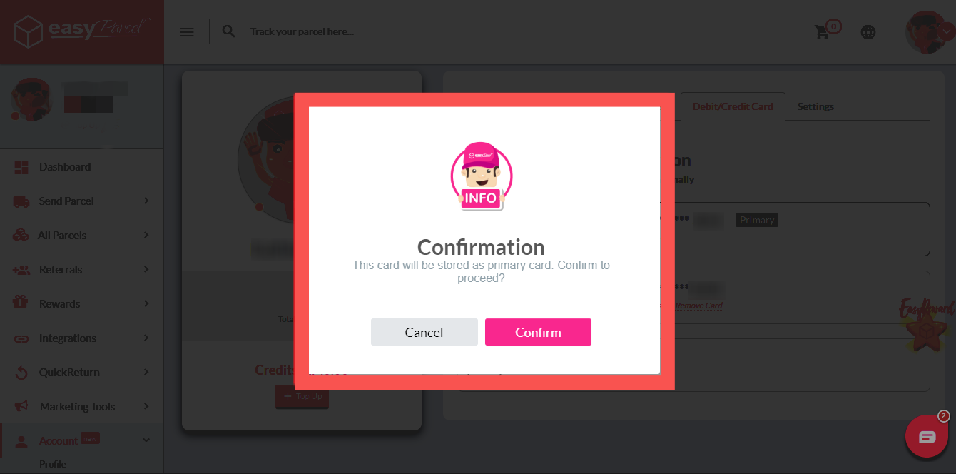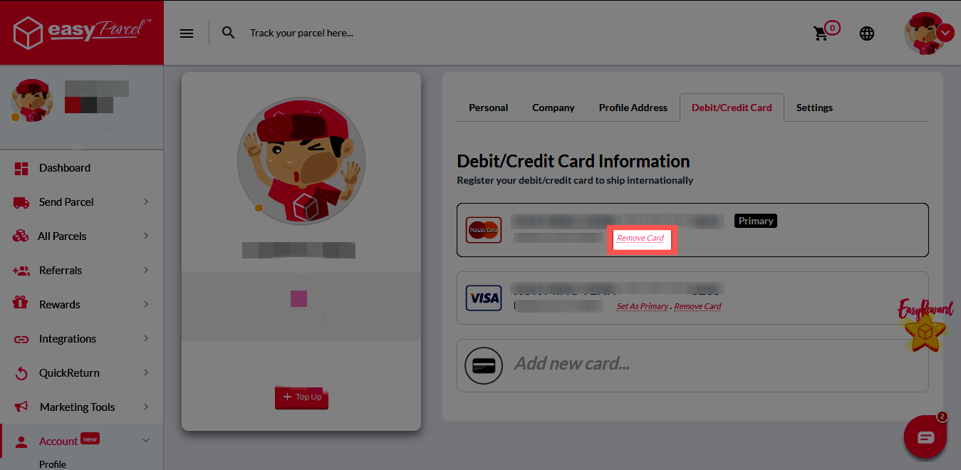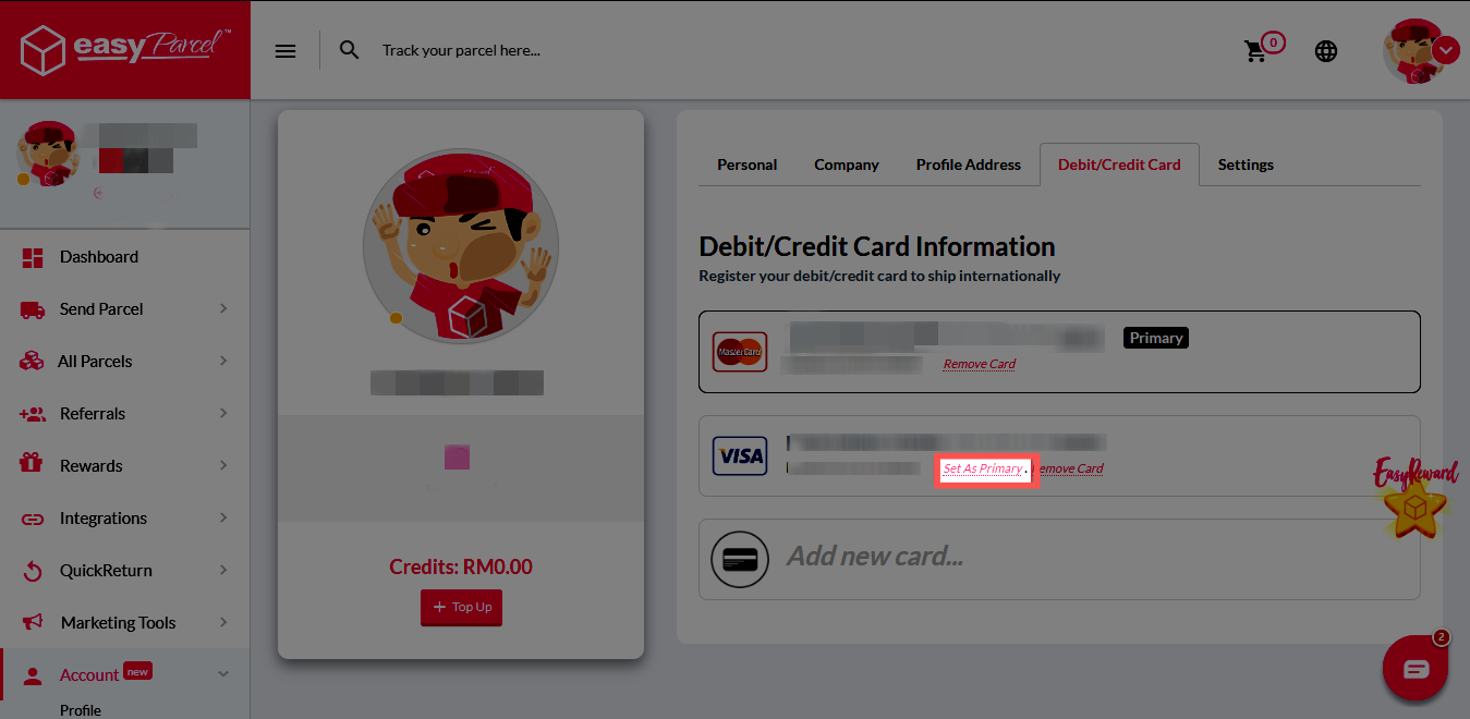 Registering a debit/credit card is a must to kickstart your international delivery booking journey. It's simple! Here's how you can do it when you log in to your EasyParcel account: