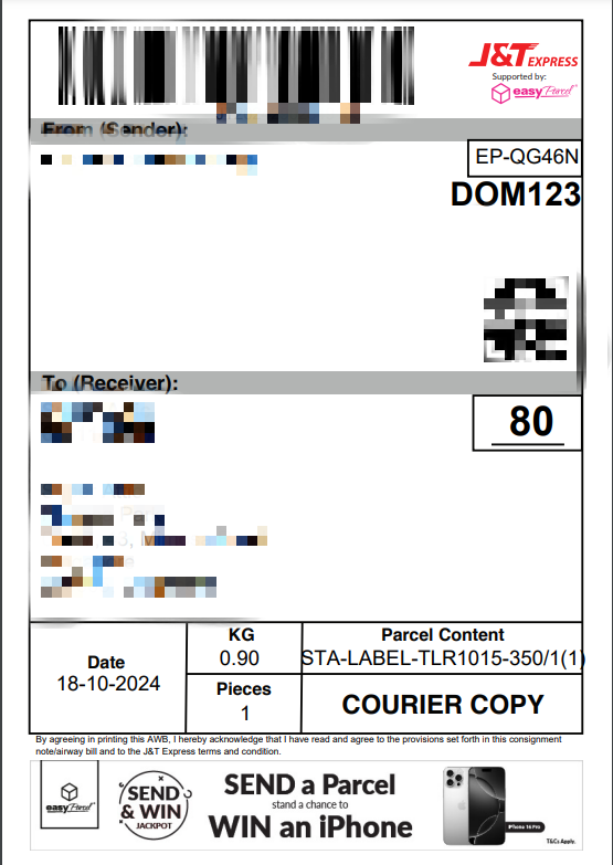 Tired of handwritten air waybill (AWB)? We at EasyParcel have got you covered with auto-generated AWB once the booking is made. All you need is just print it out and attach it on the top surface of your parcel - that's it!