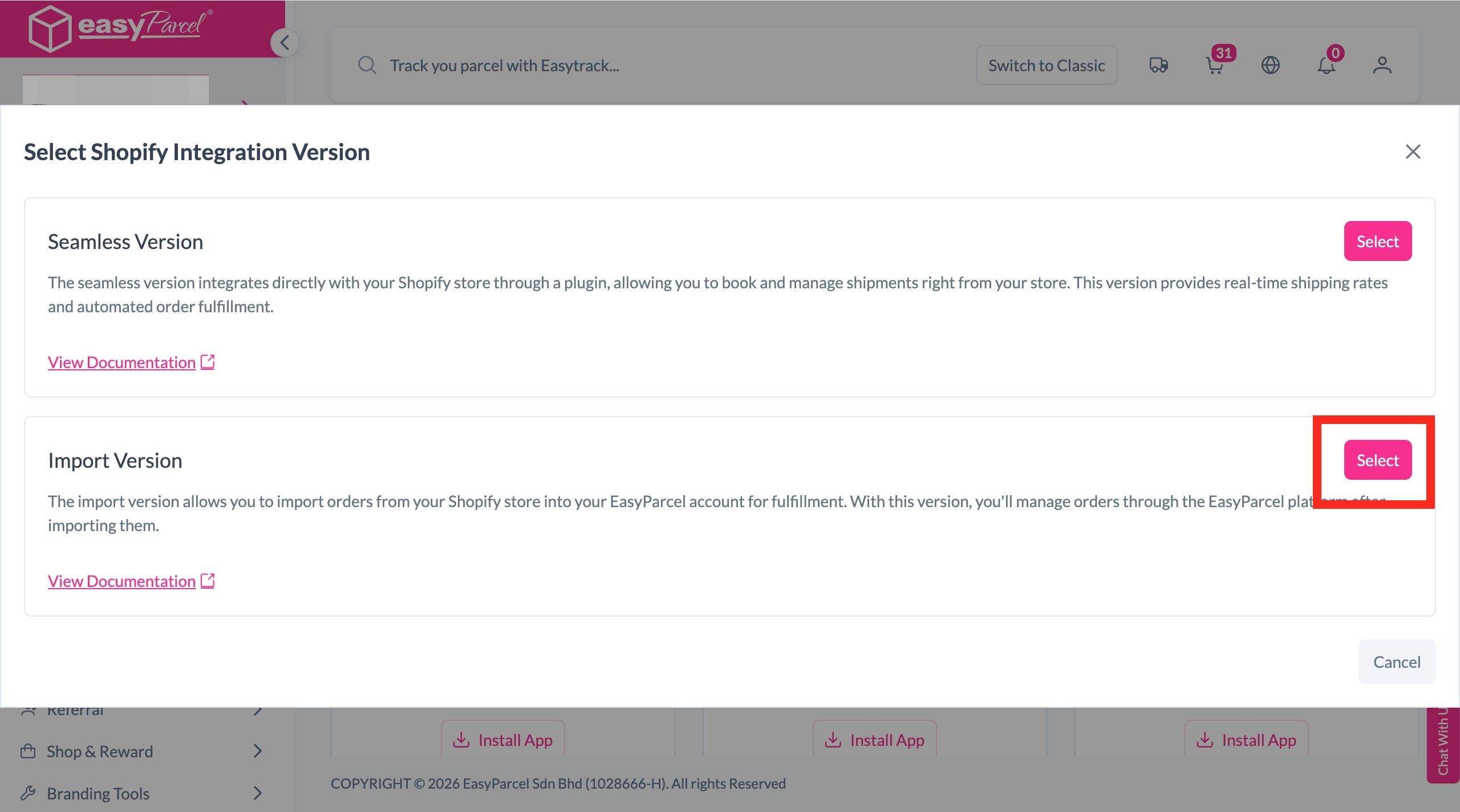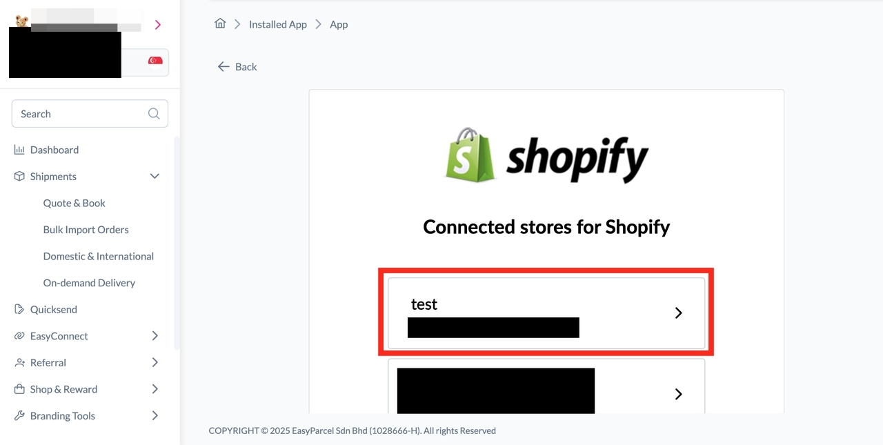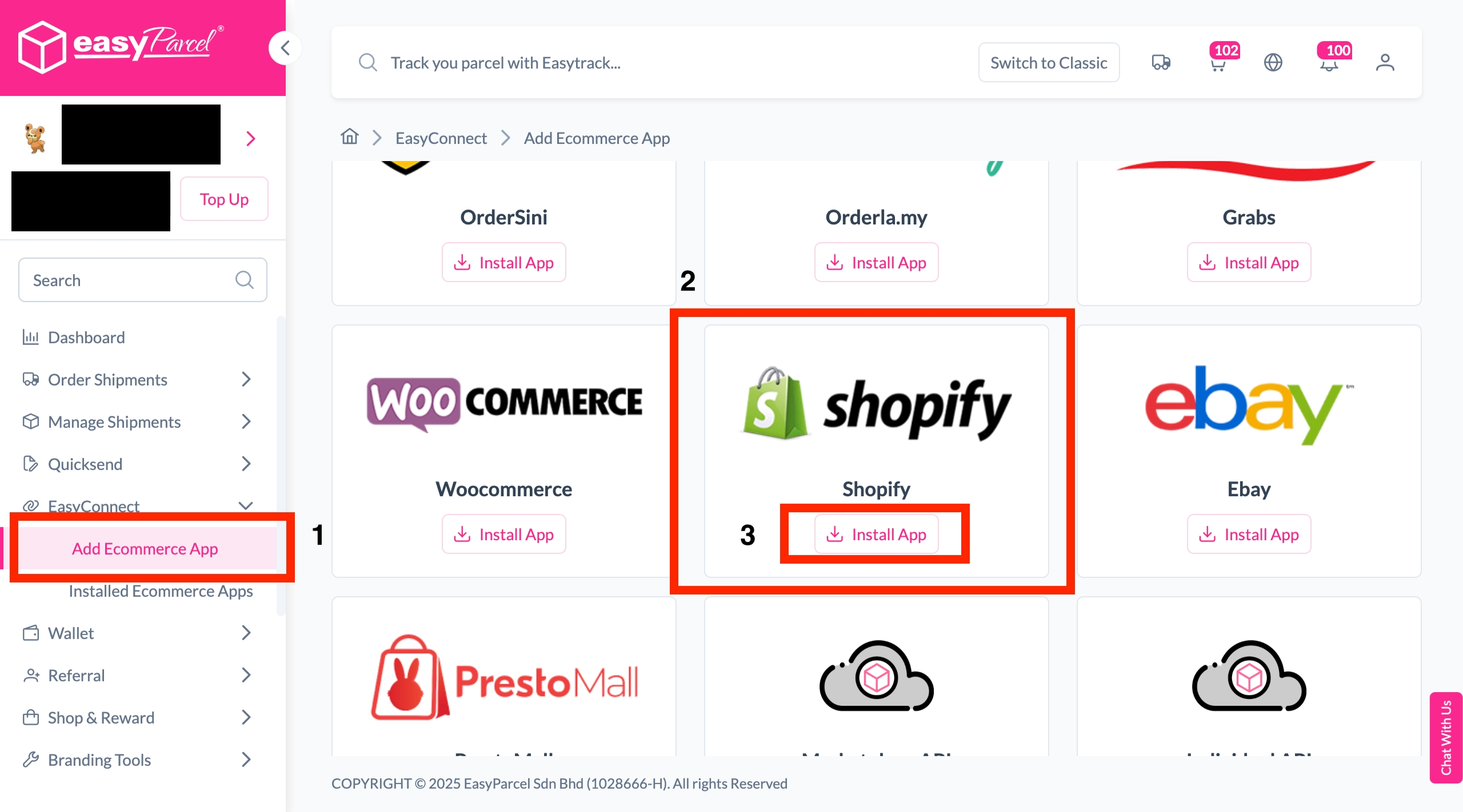 Step 1: Log into your EasyParcel account. Under EasyConnect section, click on "Add Ecommerce App", find "Shopify" and click on "Install App"