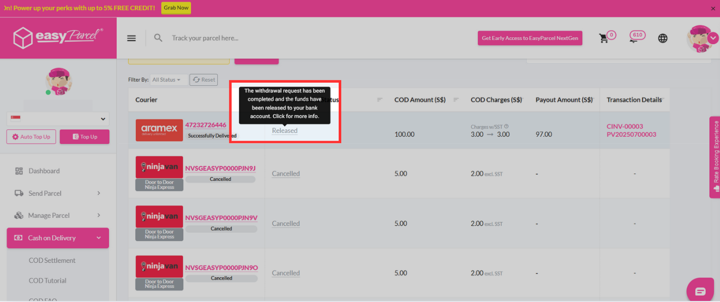 Once COD amount is ready for withdrawal, the status will change from "Pending" to "To Release". This is based on the chosen courier's timeline.