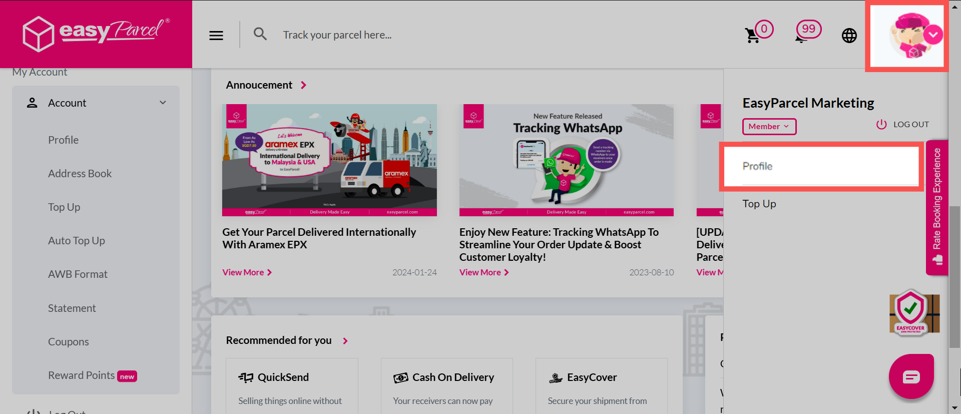 You can add or change your billing address linked to your EasyParcel account via the EasyParcel Website.