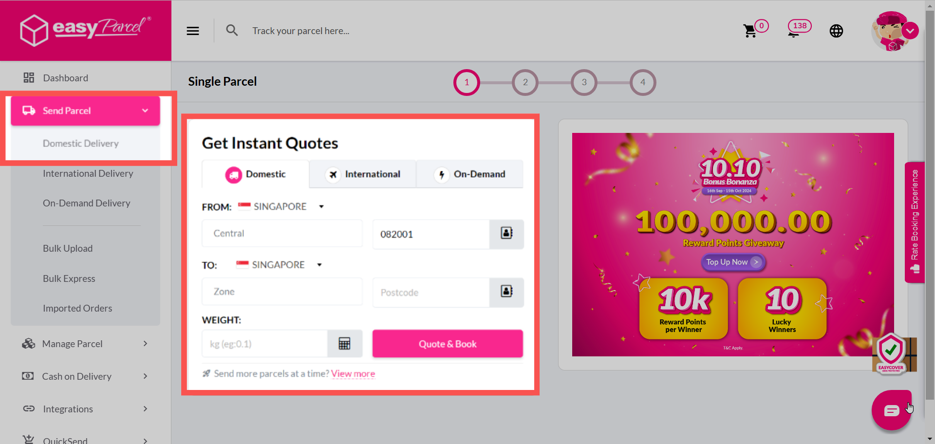 Step 1: Click 'Send Parcel' and input the necessary information such as the sender and receivers postcode, along with the parcels weight and click 'Quote & Book'.