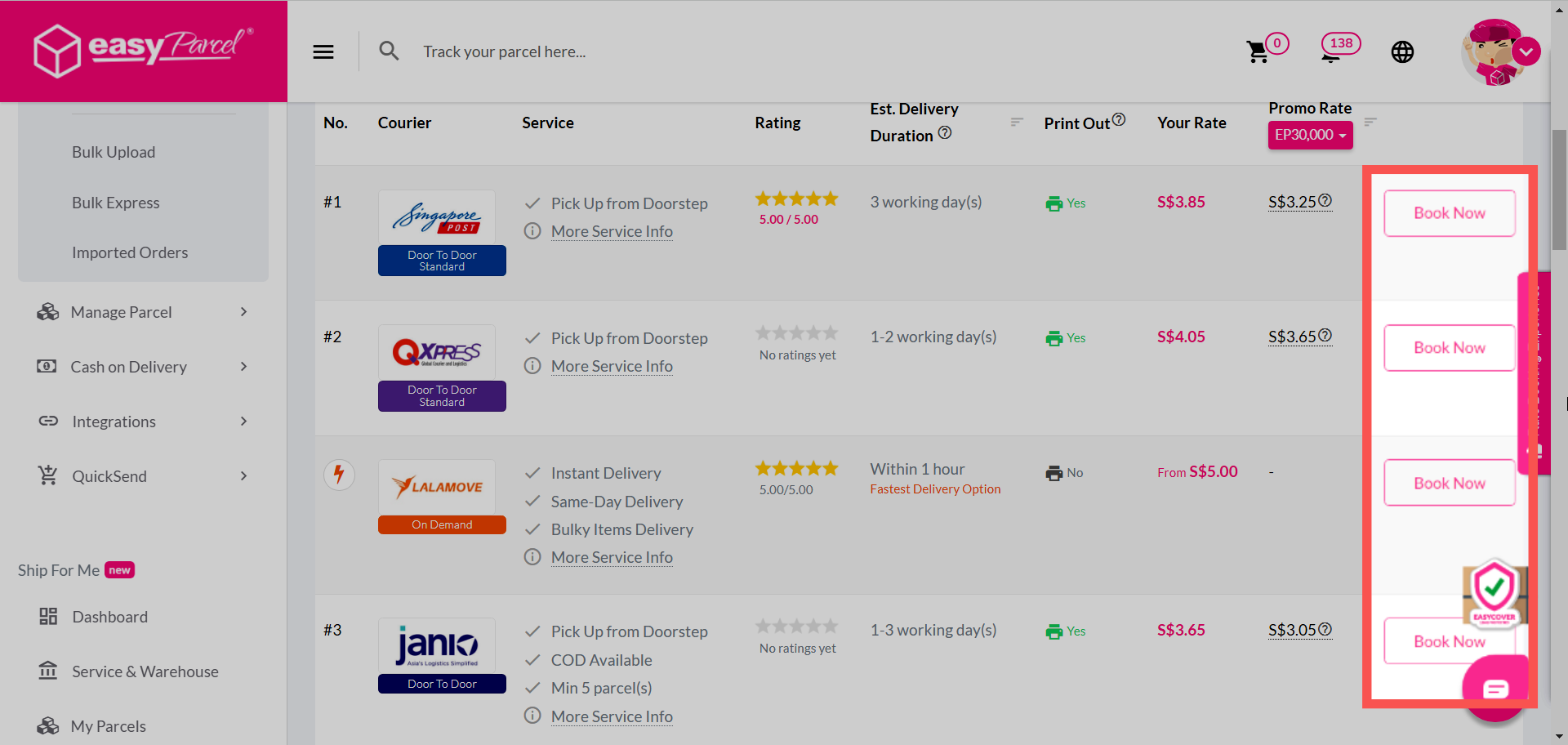 Step 2: After that, choose your preference courier service and click to 'Book Now' where you will be directed to the booking page.